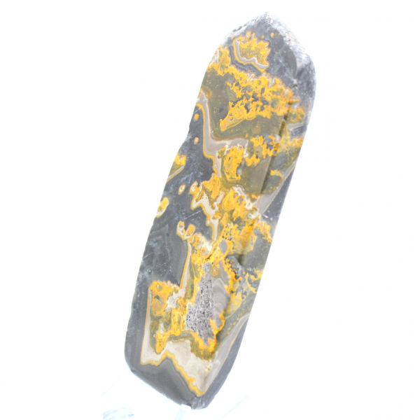 El jaspe abejorro, también conocido como jaspe abejorro, es un mineral formado por procesos volcánicos. Esta piedra se distingue por su composición mineralógica única, incorporando principalmente azufre, óxidos de manganeso y varios sulfuros como el rejalgar y el oropimente. Sus colores van del amarillo brillante al naranja, salpicados de bandas negras y grises.